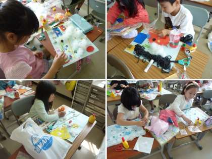 毛糸やビーズを木工用ボンドで貼り付けながら、1枚の絵を作っている2年生。