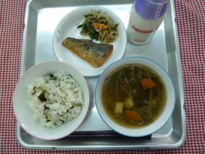 わかめ、じゃがいもののっぺい汁、さわらの西京焼き、ごまあえ、牛乳でした。