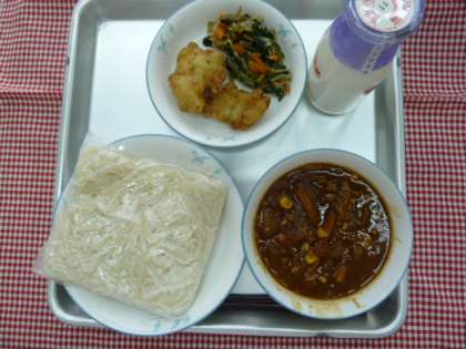 ソフトめん、肉みそかけ、あじのフリッター、もやしのおひたし、牛乳でした。