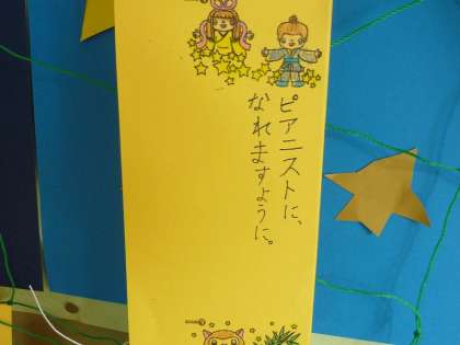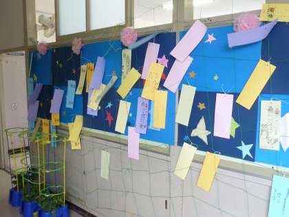 2年生の廊下に、七夕飾りが掲示され始めました。