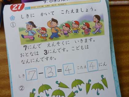 足し算引き算を勉強してきた1年生は、今日「文章題」を解いていました。