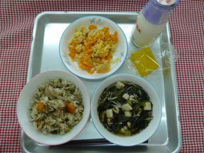 給食では、豚肉・にんじん・ごぼう・刻み昆布・ねぎを具材として炊きました。