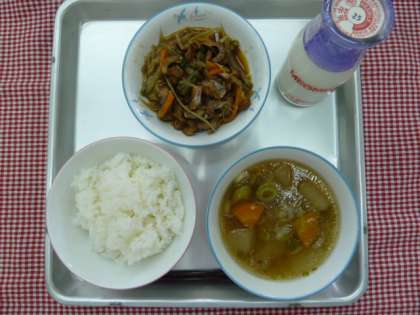 今日の給食では、穴子と一緒にごぼう・にんじん・いんげんを煮ました。
