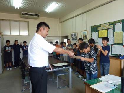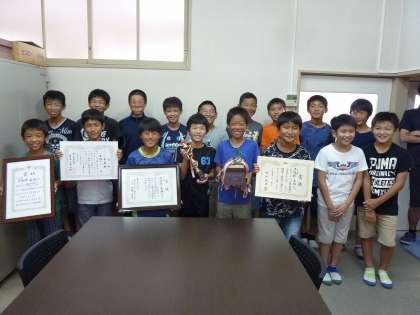 校長室にて、サッカー部・夏の大会の表彰を行いました。