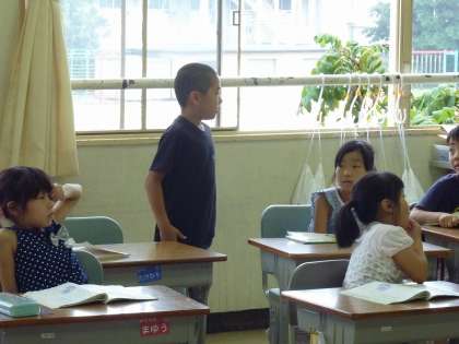 詩を朗読する時に、気をつけることを考え発表している2年生。