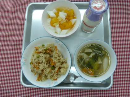 チャーハン、水ぎょうざのスープ、あんにんフルーツ、牛乳でした。