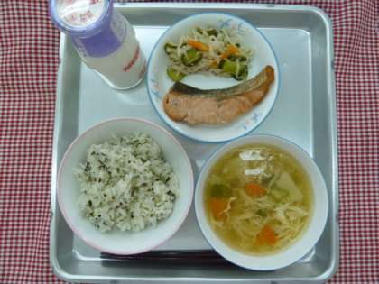 わかめごはん、かきたま汁、鮭の塩焼き、切り干し大根の甘酢あえ、牛乳でした。