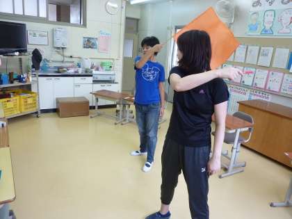 運動会に向けて、タブレットを見ながら特訓するふれあいの二人。