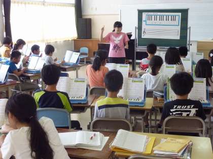 フォスターの名曲「主は冷たい土の中に」に、和音伴奏をつけている5年生。