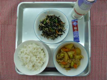 麦ごはん、じゃがいものそぼろ煮、ひじきと鶏ささみのあえもの、牛乳、ふりかけでした。