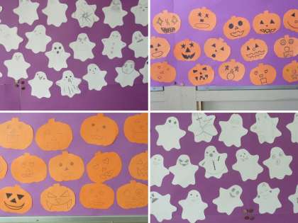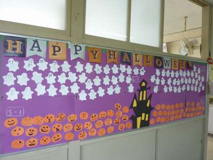 校内の英語掲示板にもカボチャや幽霊が登場しています。