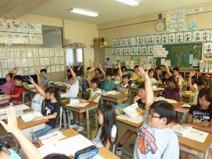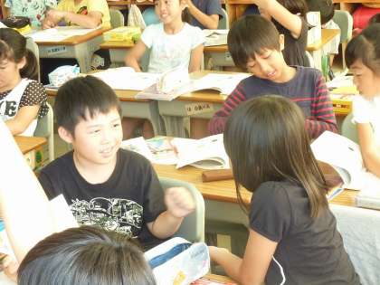 教科書に出てくる写真を見ながら、大豆を食べるための工夫についてまとめていく3年生。