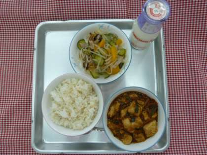 今日の給食は、発芽玄米ご飯・マーボー豆腐・中華あえ・牛乳でした。