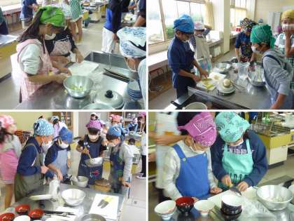 大根・あげ・ネギを刻んで、味噌汁の具材を整える5年生。