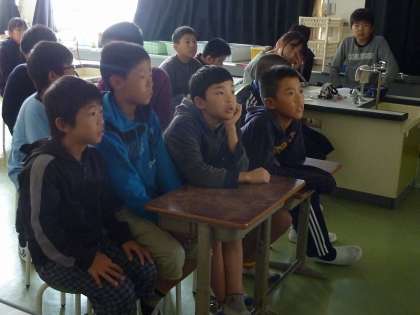 桜島の動画を見ながら、火山についての理解を深める6年生。