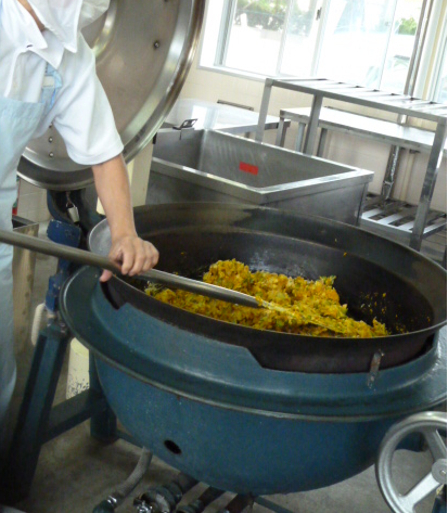 給食室では、全具材の重量30キロ程のかぼちゃサラダにマヨネーズが均等に混ざるよう、調理員さんが一生懸命作業してくれました。