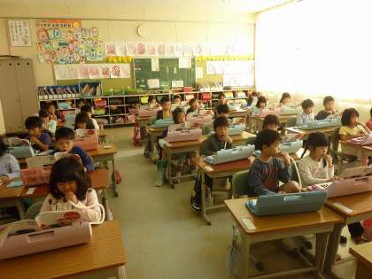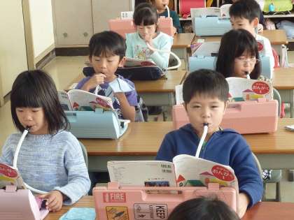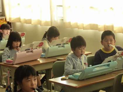 「どんぐりさんのおうち」という曲を鍵盤ハーモニカで挑戦する1年生。