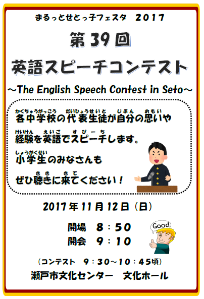 市内の中学生による「英語スピーチコンテスト」が、以下の日程で文化センター・文化ホールで行われます。