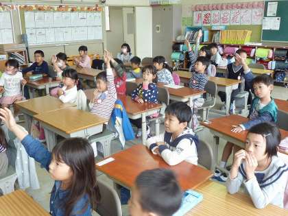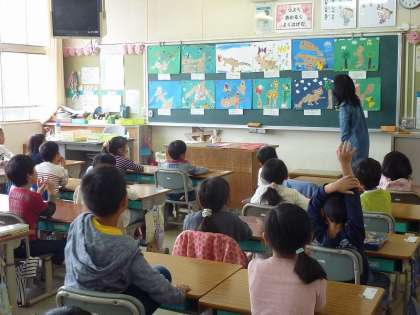 図工で作った、ちぎり絵の作品を鑑賞する1年生。