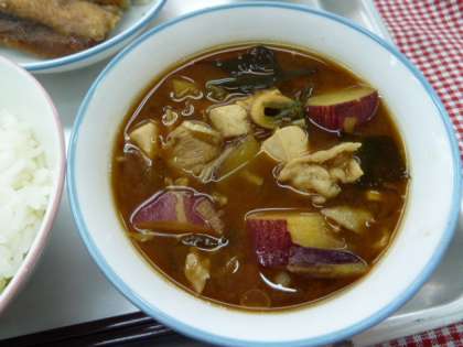 ごはん、さつまいものみそ汁、さんまのかば焼き、ゆかりあえ、牛乳でした。