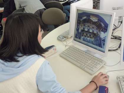 修学旅行のレポート作りに向けて、カメラ係が撮影した写真を見る6年生。