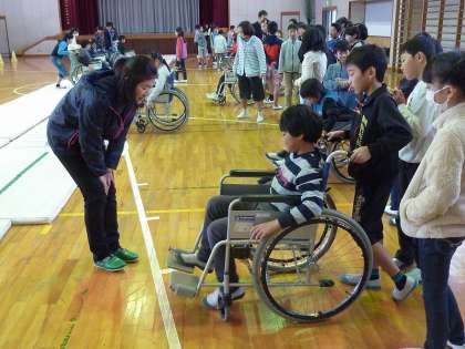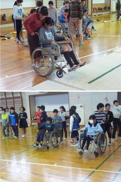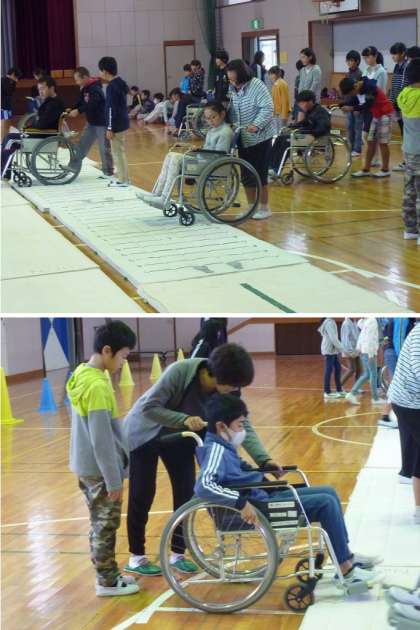 車輪を手で回したり、段差を乗り越えるための補助をしたりしながら、町の中でできることを考える機会となりました。