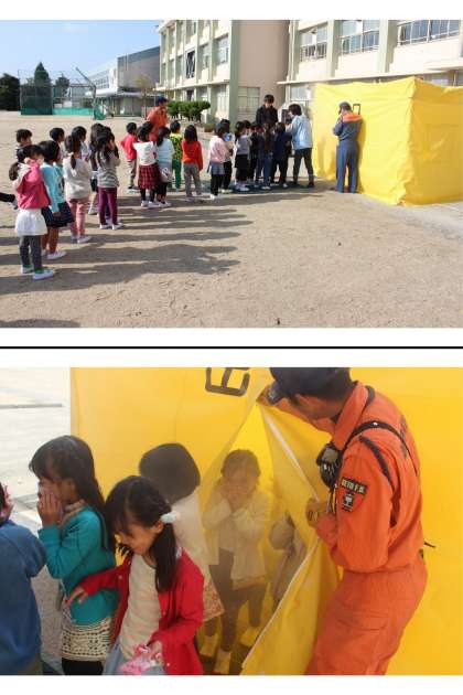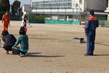 避難後は消防本部の方のお話を聞いたり、初期消火訓練を見学したりしました。