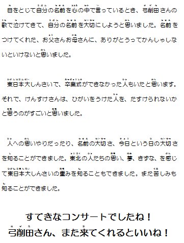 それらを読んでいると、弓削田さんの歌声を聞いて泣いていた子も多数おり驚きました。