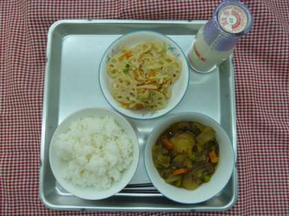 ごはん、肉じゃが、れんこんのごまあえ、牛乳でした。