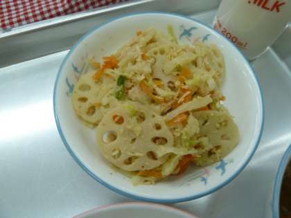 れんこんのごまあえには、鶏ささみ、れんこん、キャベツ、にんじんが入っていました。