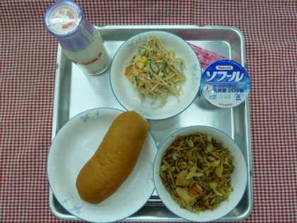 小型ロールパン、瀬戸焼きそば、ごぼうサラダ、牛乳、ヨーグルトでした。