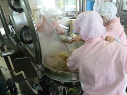 給食室では、野菜と麺を混ぜ合わせるのに2人で息を合わせていました。