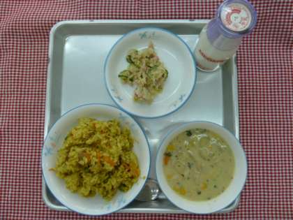 カレーピラフ、豆乳スープ、ツナサラダ、牛乳でした。