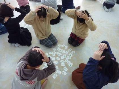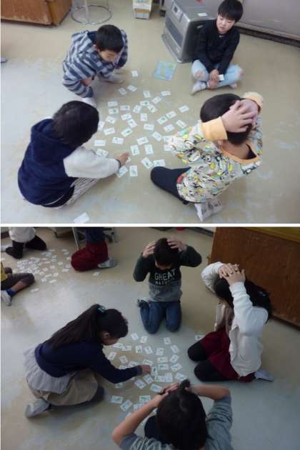 都道府県の名産や名所の書かれた読み札を、先生が読んでくれます。