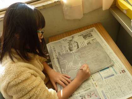 石膏版画を彫り始めた3年生。