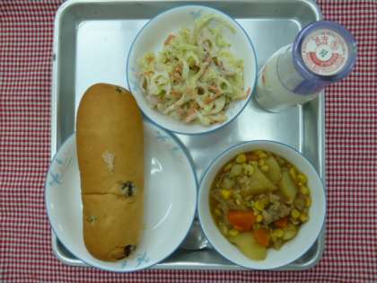 今日の給食は、レーズンロールパン、じゃがいものバター煮、キャベツとれんこんのサラダ、牛乳でした。