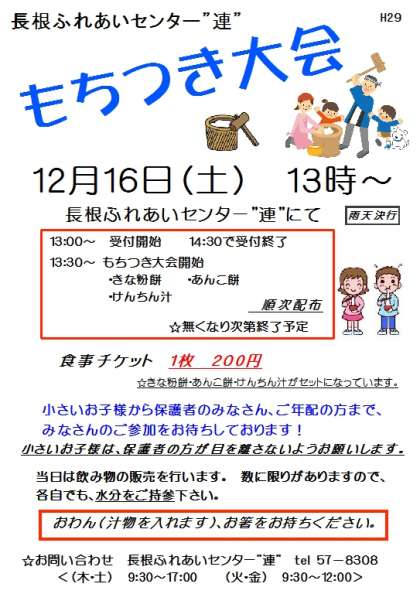 ふれあいセンター連で、明日の午後「もちつき大会」が行われます。