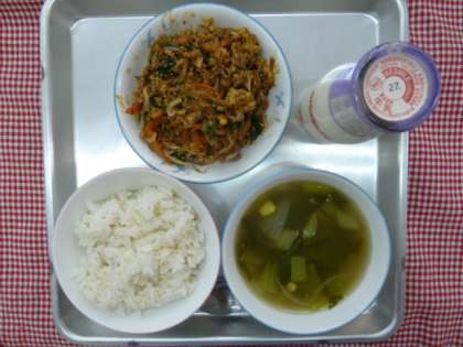 今日の給食は、麦ごはん・ビビンバ・チンゲン菜のスープ・牛乳でした。