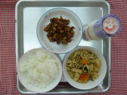 今日の給食は、ごはん・親子煮・大豆とごぼうの甘辛揚げ・牛乳でした。
