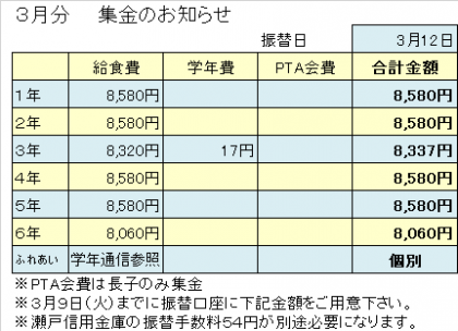 3月は再振替がございませんので、ご注意下さい。今月の給食費は、2月分(実績)と3月分(見込)の2ヶ月分集金します。