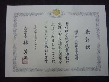 昨日、子どもの読書活動優秀実践校の表彰式が東京で行われ、教頭先生が表彰状を持ち帰ってくれました。