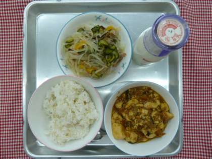 今日の給食は、麦ごはん・マーボー豆腐・中華あえ・牛乳でした。