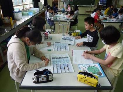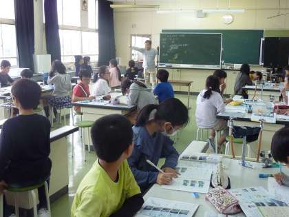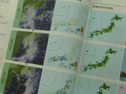 天気図の見方を勉強し、毎日の天候の変化を理解する5年生。