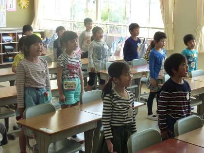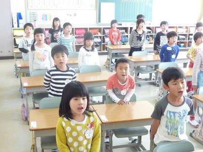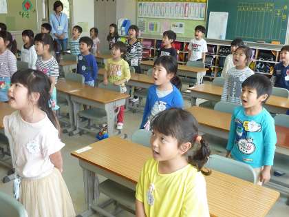 大きな声で元気よく「長根小学校の校歌」を歌う1年生。