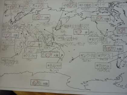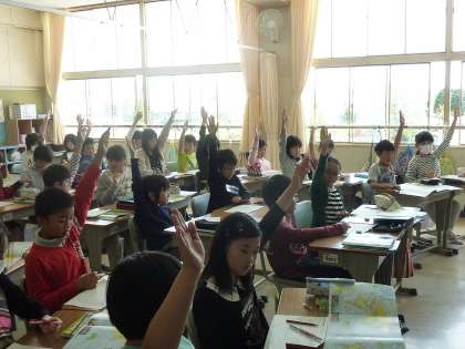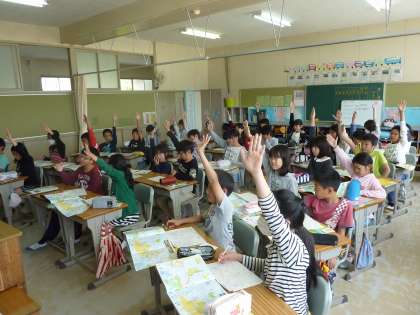 世界地図に国名を書き込んで、元気よく手を挙げる5年生。