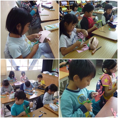 紙に手形を書いて、切り取っている表情は真剣そのもの。