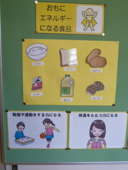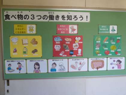 食べ物は、働きの違いで黄色・赤色・緑色の3色に分けられることを紹介しています。