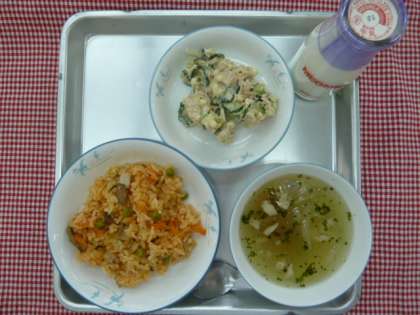 今日は、チキンライス・コンソメスープ・チーズインツナサラダ・牛乳でした。