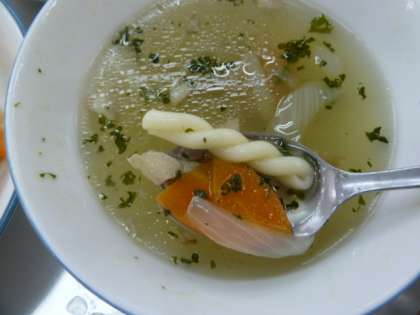 コンソメスープには、かわいらしい形のツイストマカロニが入っていました。