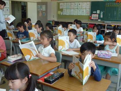たんぽぽのちえのお話を、教科書を持って上手に聞く2年生。